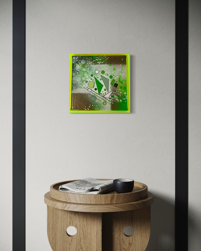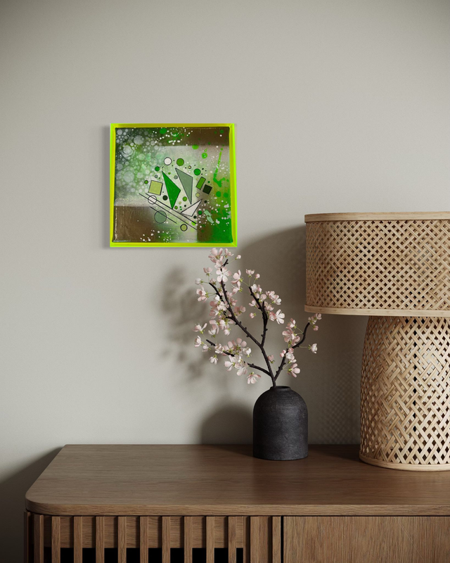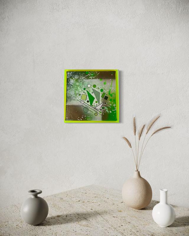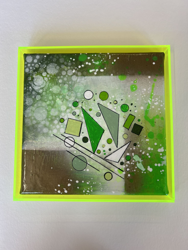 Aus meiner Serie Geometrix , Geometrix Green, 20 x 20 cm, Acryl auf Keilrahmen, inklusive Acrylrahmen in Neongrün,
