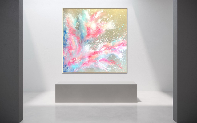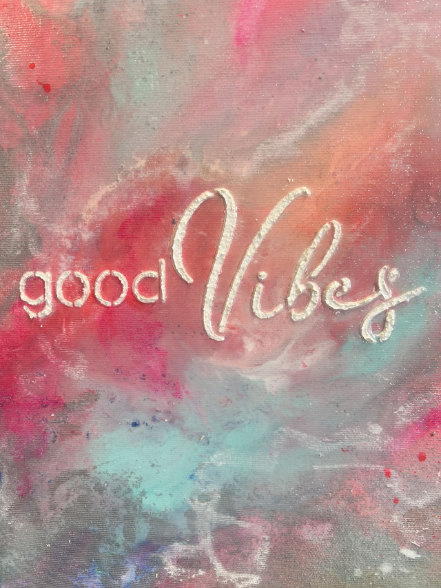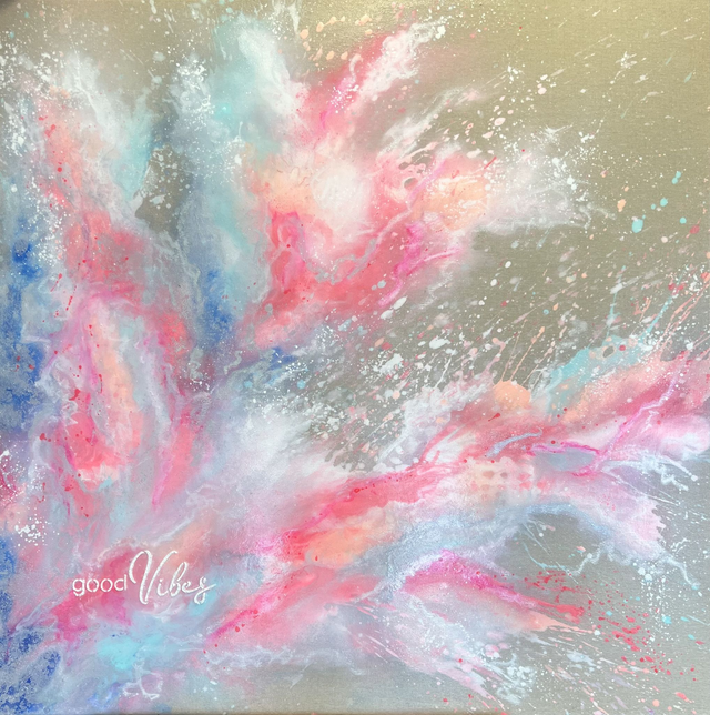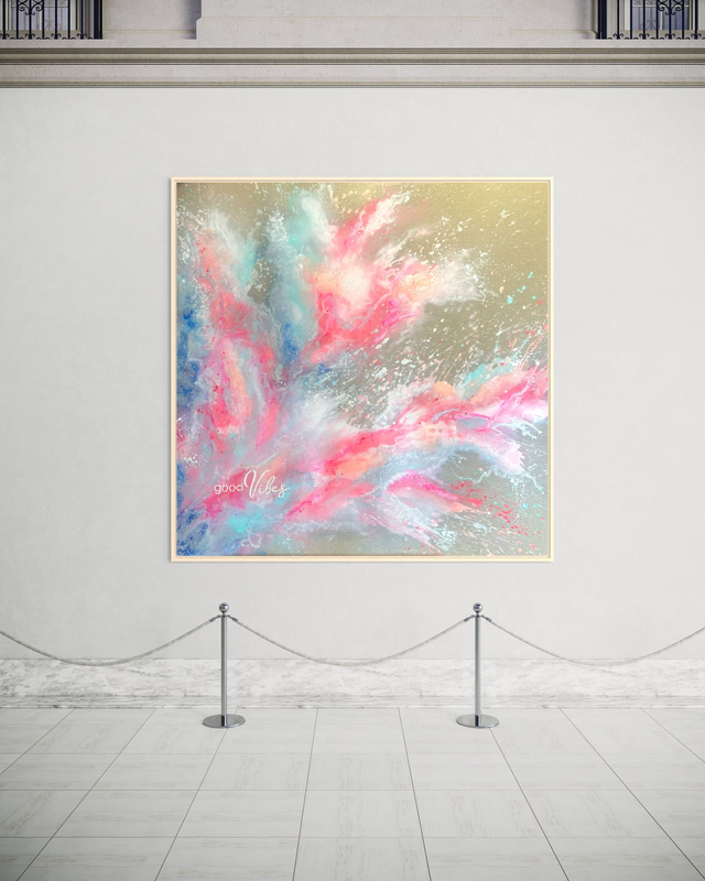 Kunstwerk good Vibes aus meiner Serie Shape of Emotions, Acryl auf einem Keilrahmen Raw Canvas,100 x100 cm, inklusive Schattenfugenrahmen in natur. Alle meine Bilder sind versiegelt mit einem Schlussfirnis und werden versendet und übergeben mit einem Echtheitszertifikat. Der Schriftzug auf dem Bild ist gestaltelt mit Strukturpaste, leicht erhaben in 3 D Optik.