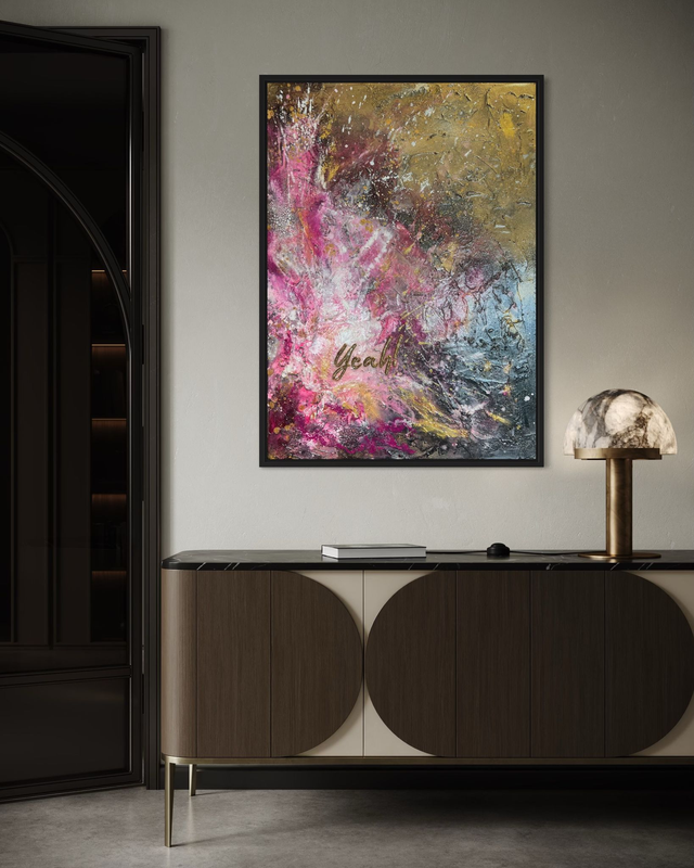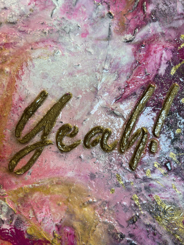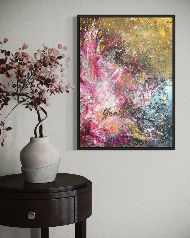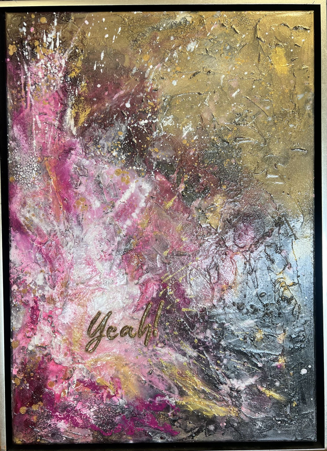 Yeah, 50 x 70 cm, inklusive Schattenfugenrahmen in Schwarz mit Goldkante ( helles Gold), Acrylfarbe, Strukturpaste auf Keilrahmen,